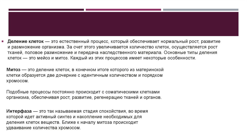 Деление клеток — это естественный процесс, который обеспечивает нормальный рост, развитиеи размножение организма. За счет этого увеличивается количество клеток, осуществляется рост