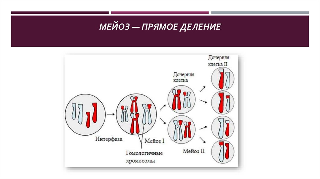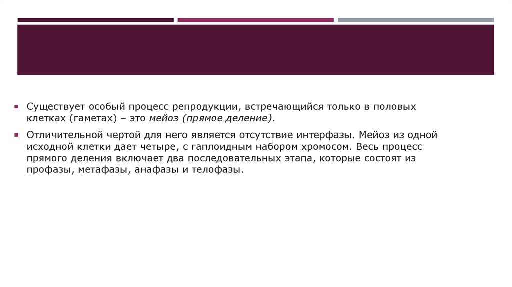 Существует особый процесс репродукции, встречающийся только в половыхклетках (гаметах) – это мейоз (прямое деление).