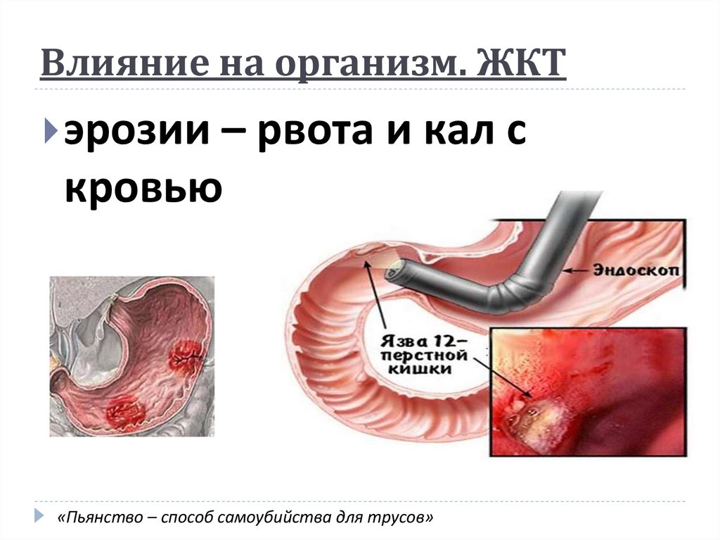 Влияние на организм. ЖКТэрозии – рвота и кал с