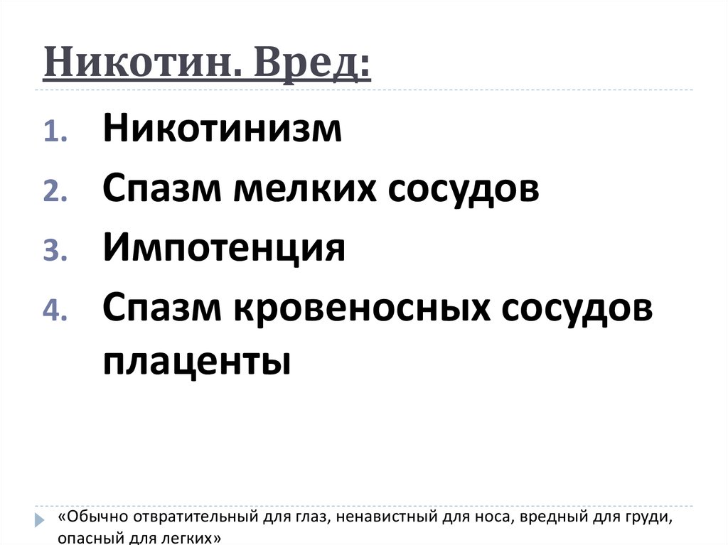 Никотин«Обычно отвратительный для глаз, ненавистный для носа, вредный для груди,
