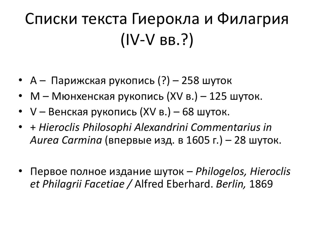 • Первое полное издание шуток – Philogelos, Hieroclis