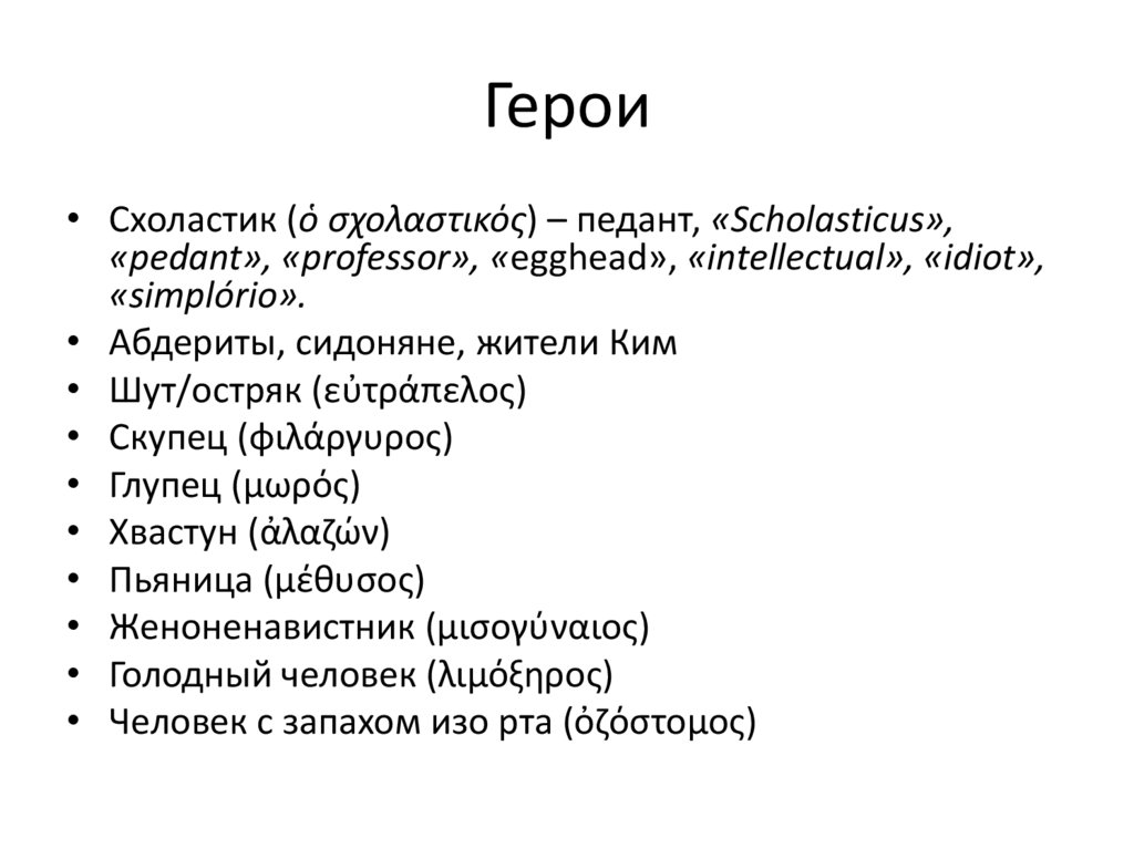 Герои• Схоластик (ὁ σχολαστικός) – педант, «Scholasticus»,