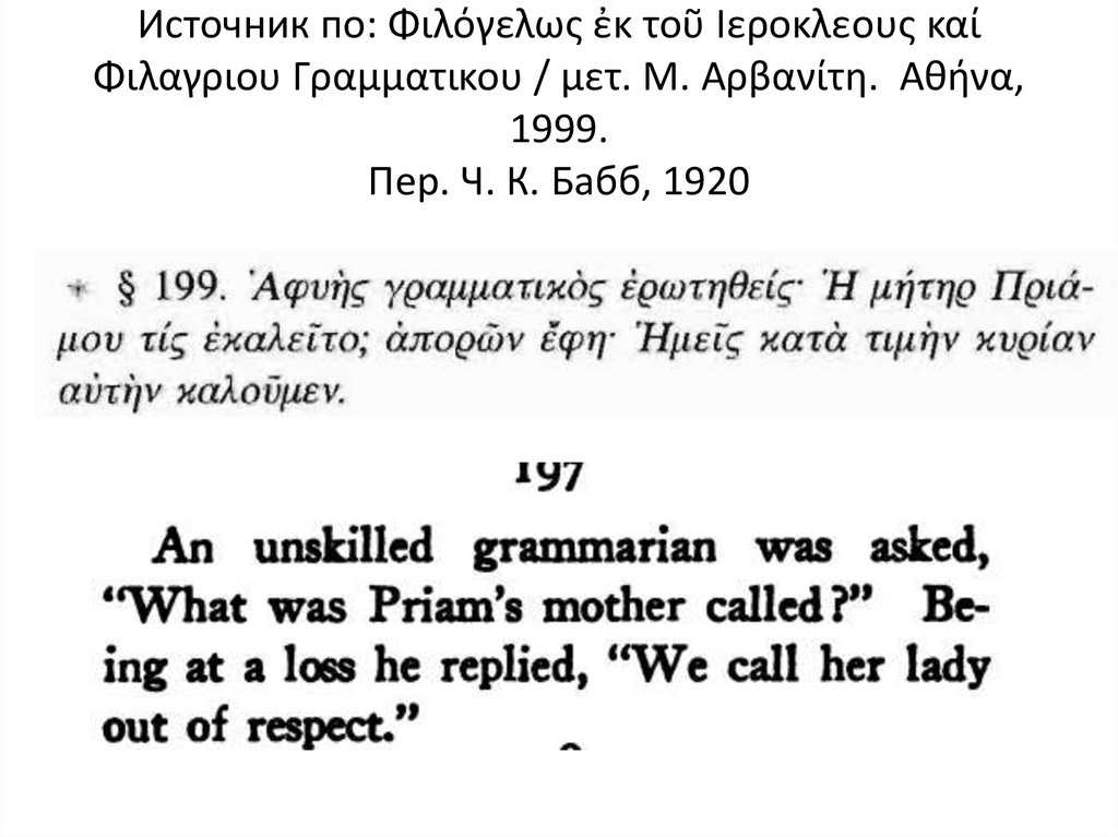 Источник по: Φιλόγελως ἐκ τοῦ Ιεροκλεους καίΦιλαγριου Γραμματικου / μετ. Μ. Αρβανίτη. Αθήνα,