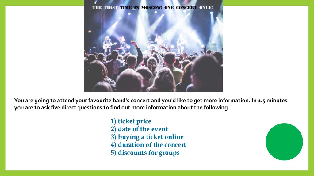 You are going to attend your favourite band's concert and you'd like to get more information. In 1.5 minutesyou are to ask five direct questions to find out more information about the following