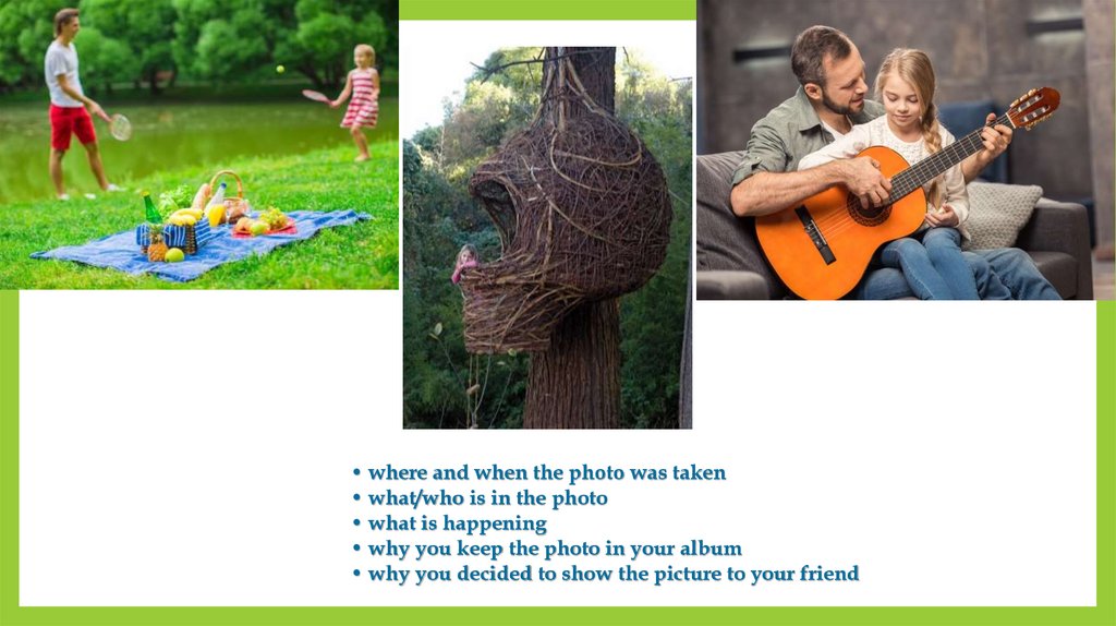• where and when the photo was taken• what/who is in the photo