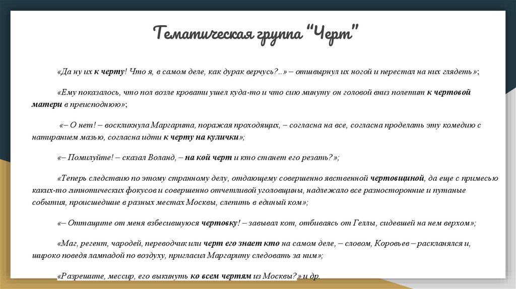 Тематическая группа “Черт”«Да ну их к черту! Что я, в самом деле, как дурак верчусь?..» – отшвырнул их ногой и перестал на них глядеть»;