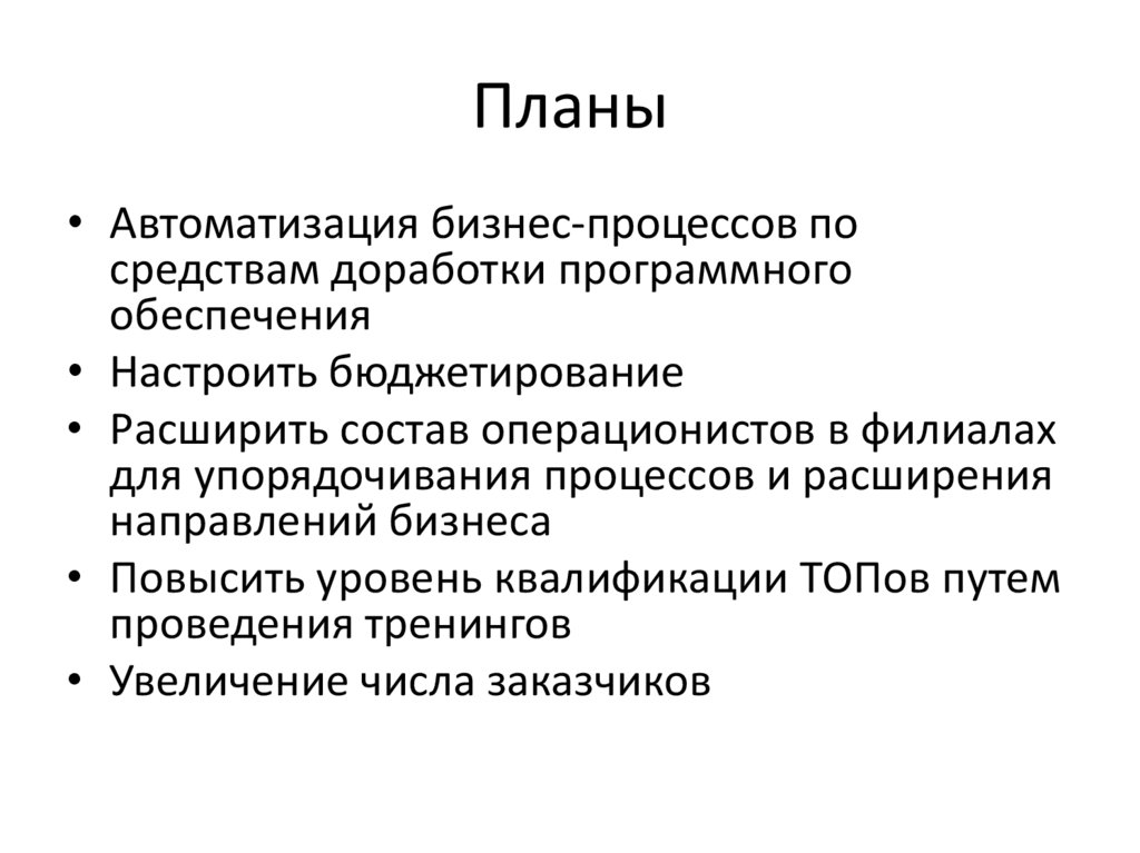 Планы• Автоматизация бизнес-процессов по