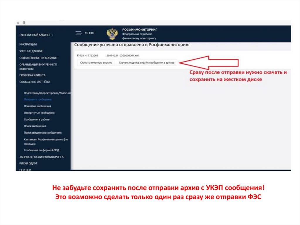 Не забудьте сохранить после отправки архив с УКЭП сообщения!Это возможно сделать только один раз сразу же отправки ФЭС
