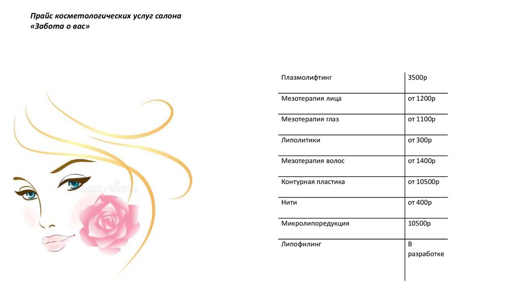 Прайс косметологических услуг салона«Забота о вас»