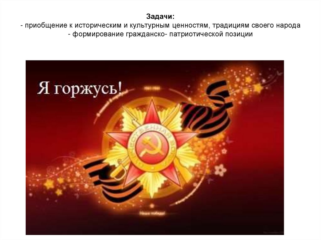 Задачи:- приобщение к историческим и культурным ценностям, традициям своего народа