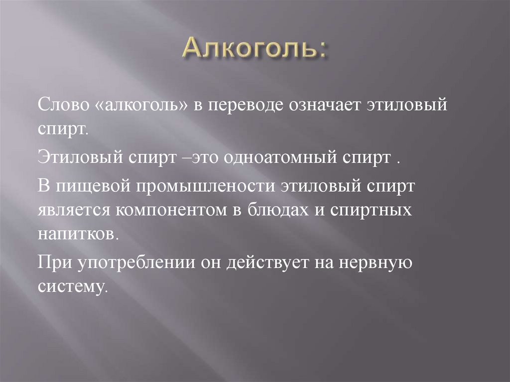 Слово «алкоголь» в переводе означает этиловыйспирт.
