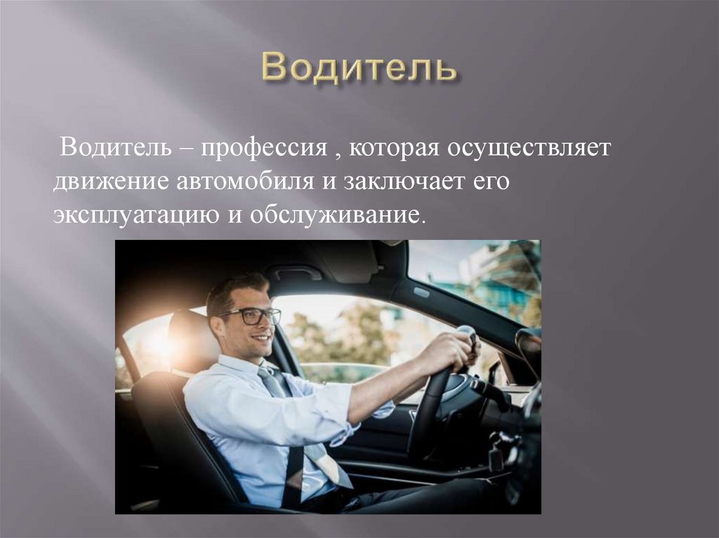 Водитель – профессия , которая осуществляетдвижение автомобиля и заключает его