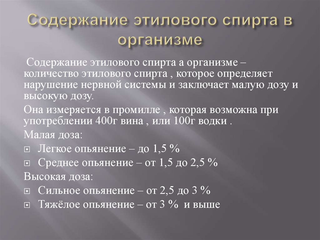 Содержание этилового спирта а организме –количество этилового спирта , которое определяет