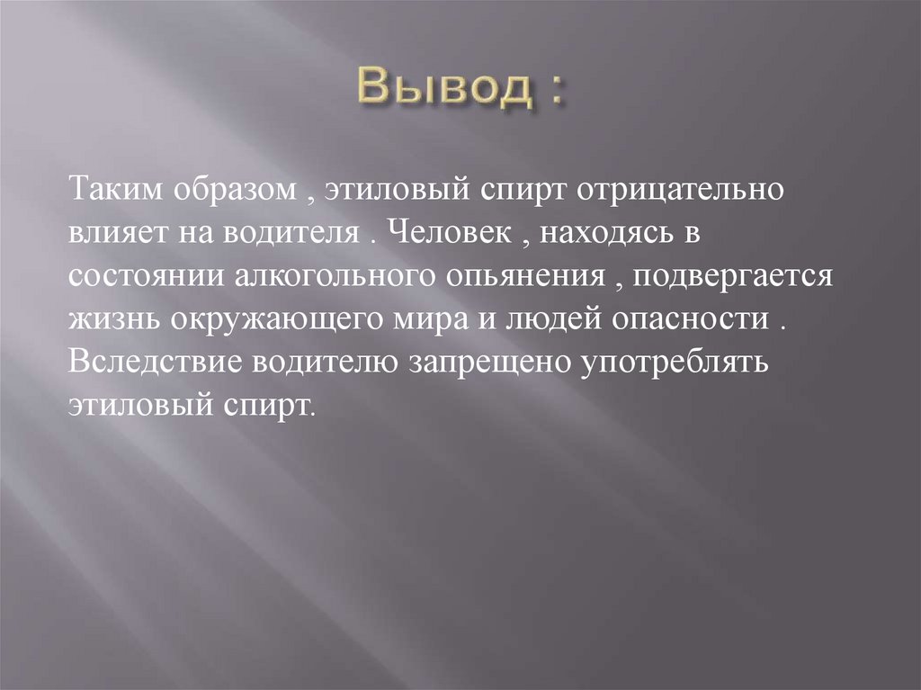 Таким образом , этиловый спирт отрицательновлияет на водителя . Человек , находясь в