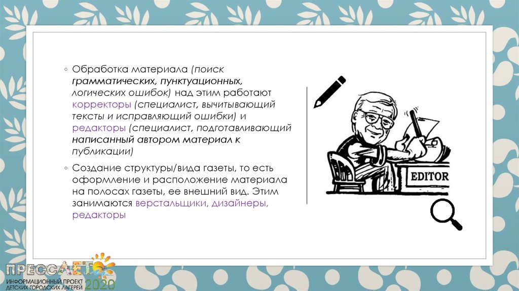 ◦ Обработка материала (поискграмматических, пунктуационных,