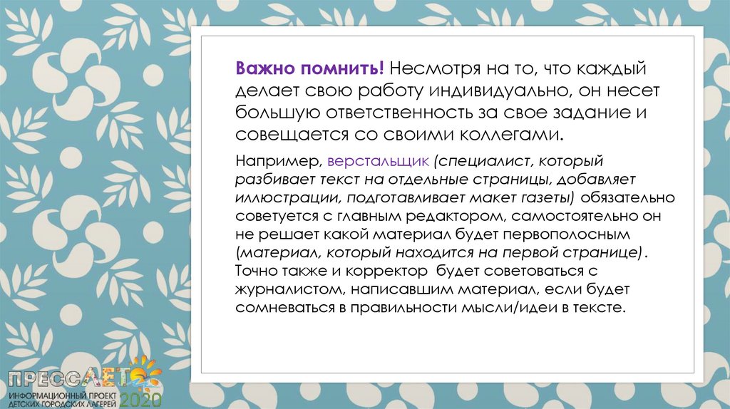 Важно помнить! Несмотря на то, что каждыйделает свою работу индивидуально, он несет