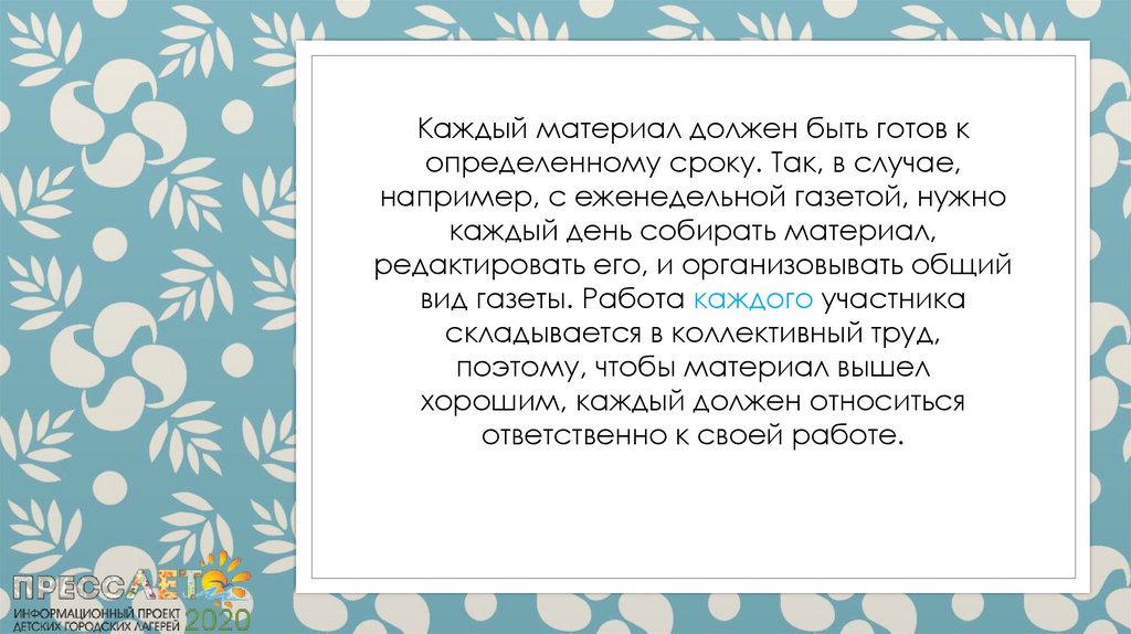 Каждый материал должен быть готов копределенному сроку. Так, в случае,