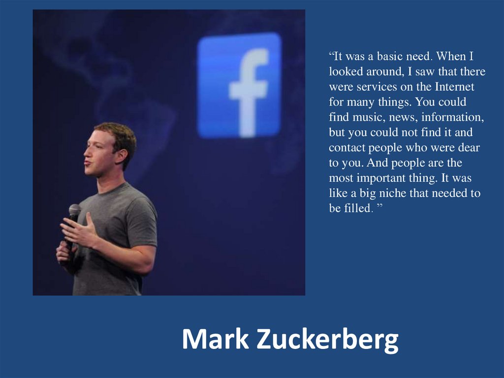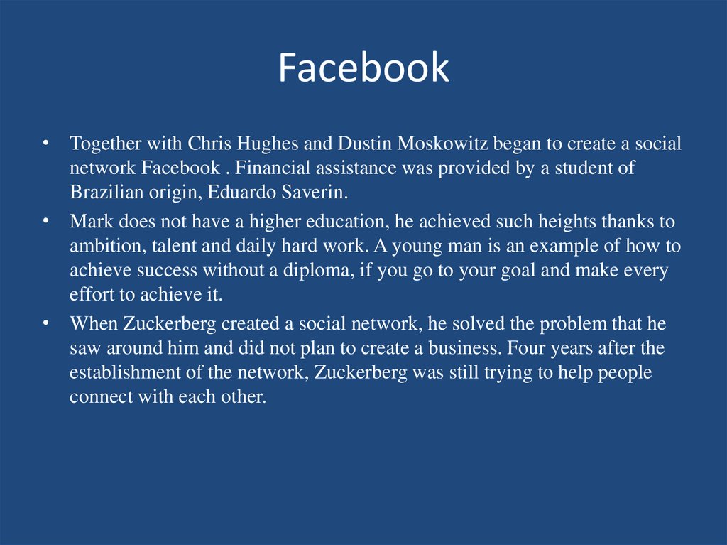 Facebook• Together with Chris Hughes and Dustin Moskowitz began to create a social