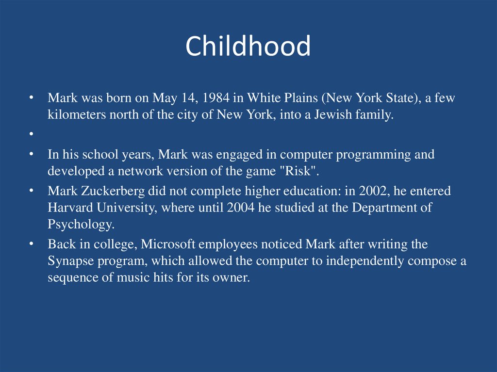 Childhood• Mark was born on May 14, 1984 in White Plains (New York State), a few