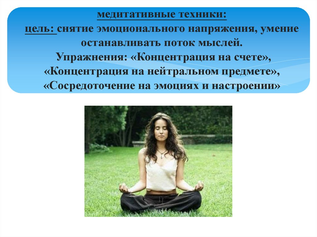 медитативные техники:цель: снятие эмоционального напряжения, умение