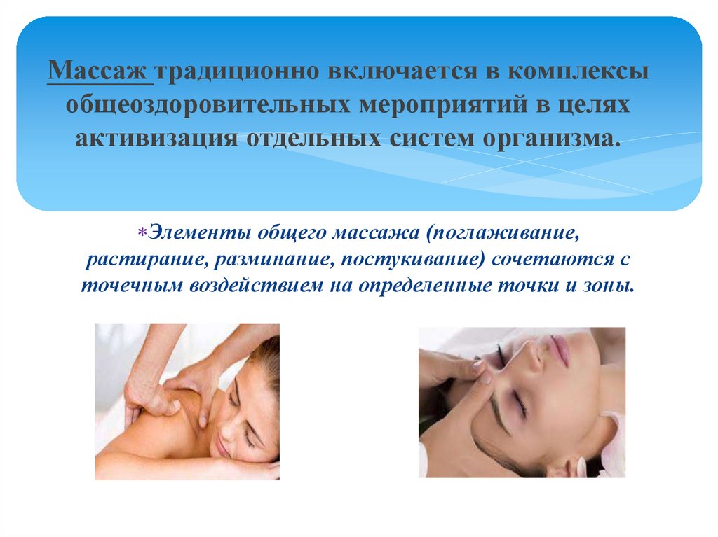 Массаж традиционно включается в комплексыобщеоздоровительных мероприятий в целях