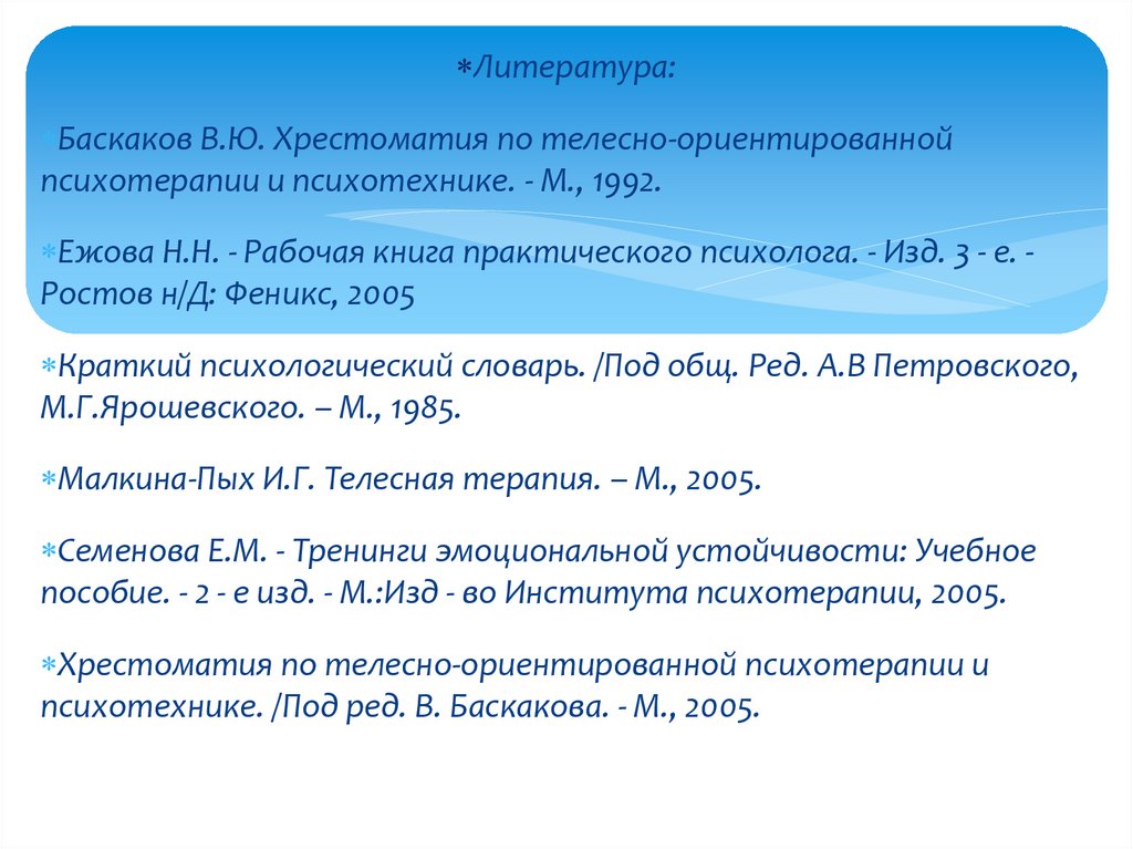 Литература:Баскаков В.Ю. Хрестоматия по телесно-ориентированной