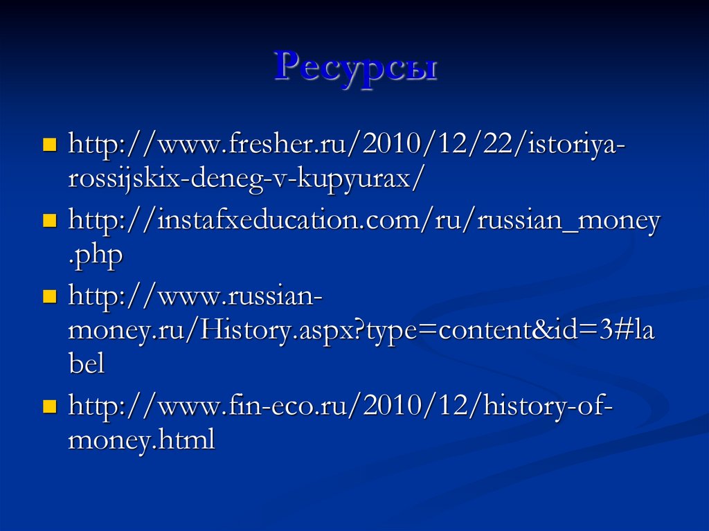 Ресурсыhttp://www.fresher.ru/2010/12/22/istoriyarossijskix-deneg-v-kupyurax/