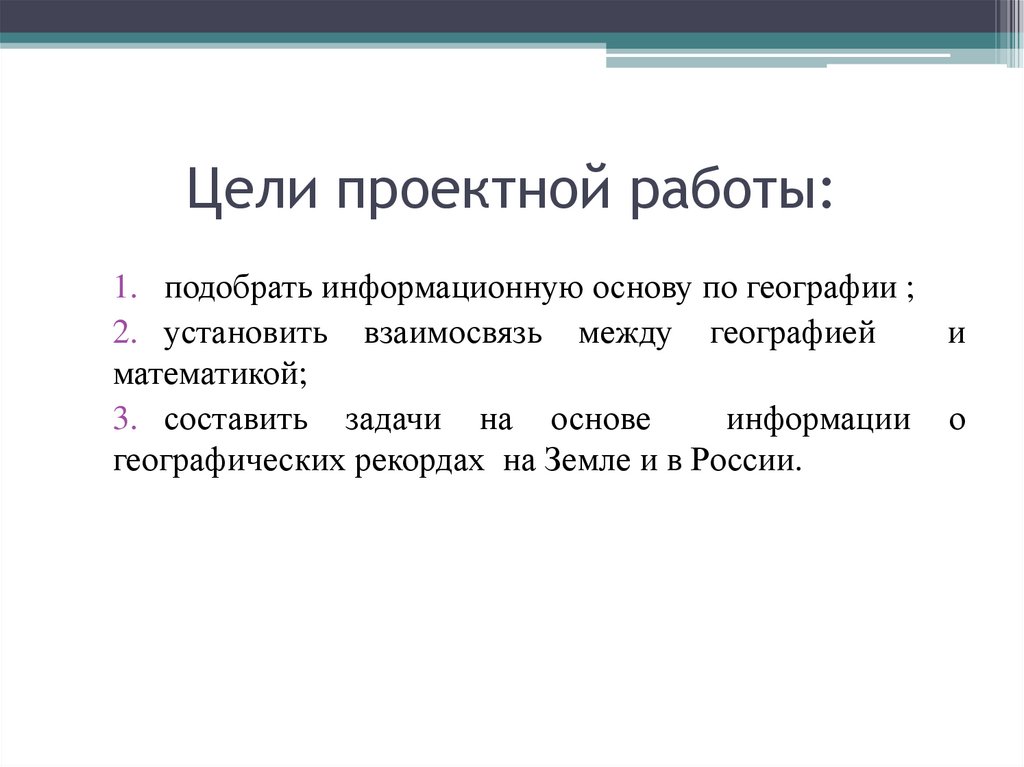Цели проектной работы:1. подобрать информационную основу по географии ;