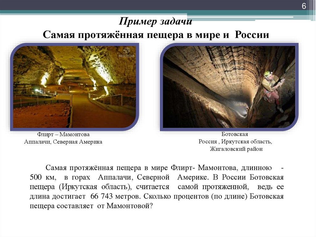 Самая протяжённая пещера в мире Флирт- Мамонтова, длинною 500 км, в горах Аппалачи, Северной Америке. В России Ботовская