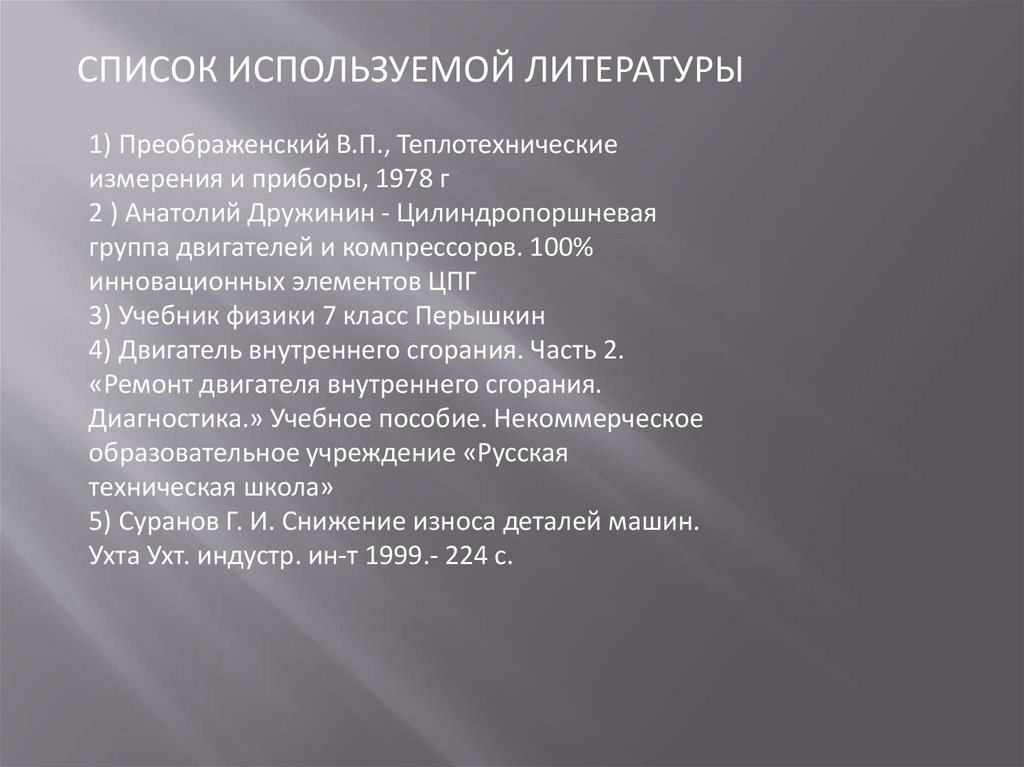 СПИСОК ИСПОЛЬЗУЕМОЙ ЛИТЕРАТУРЫ1) Преображенский В.П., Теплотехнические