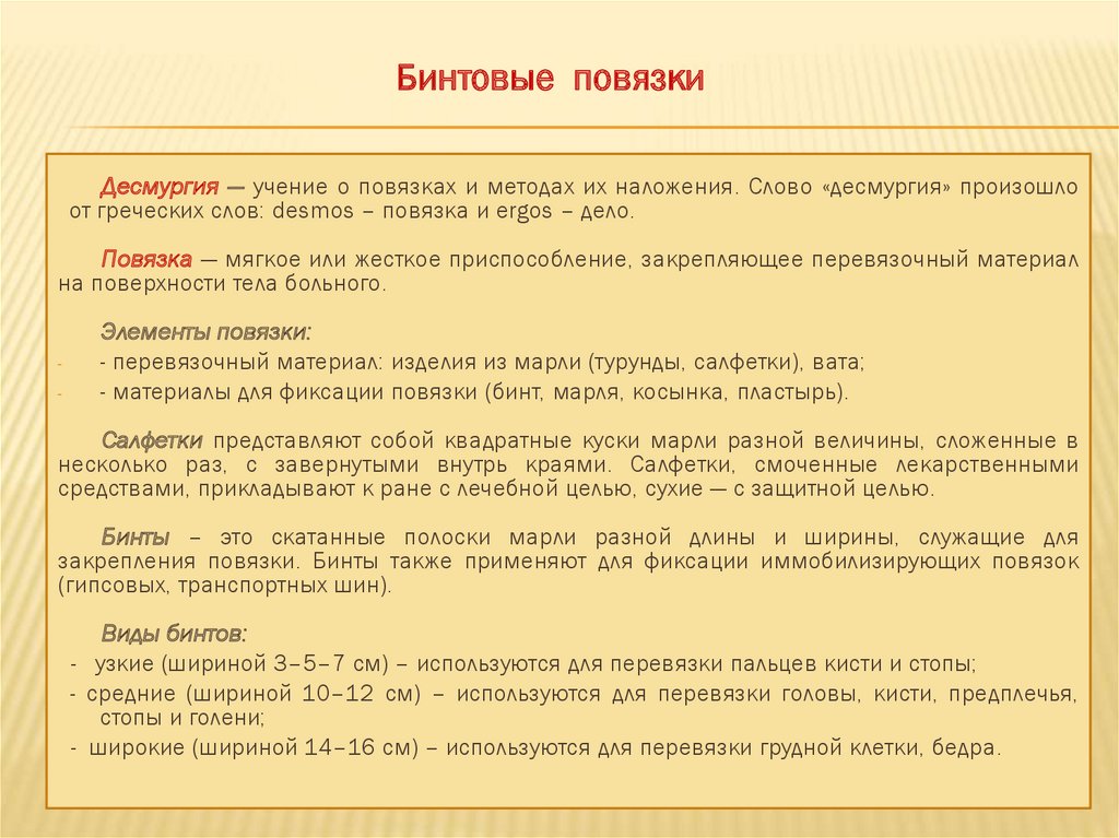 Бинтовые повязкиДесмургия — учение о повязках и методах их наложения. Слово «десмургия» произошло