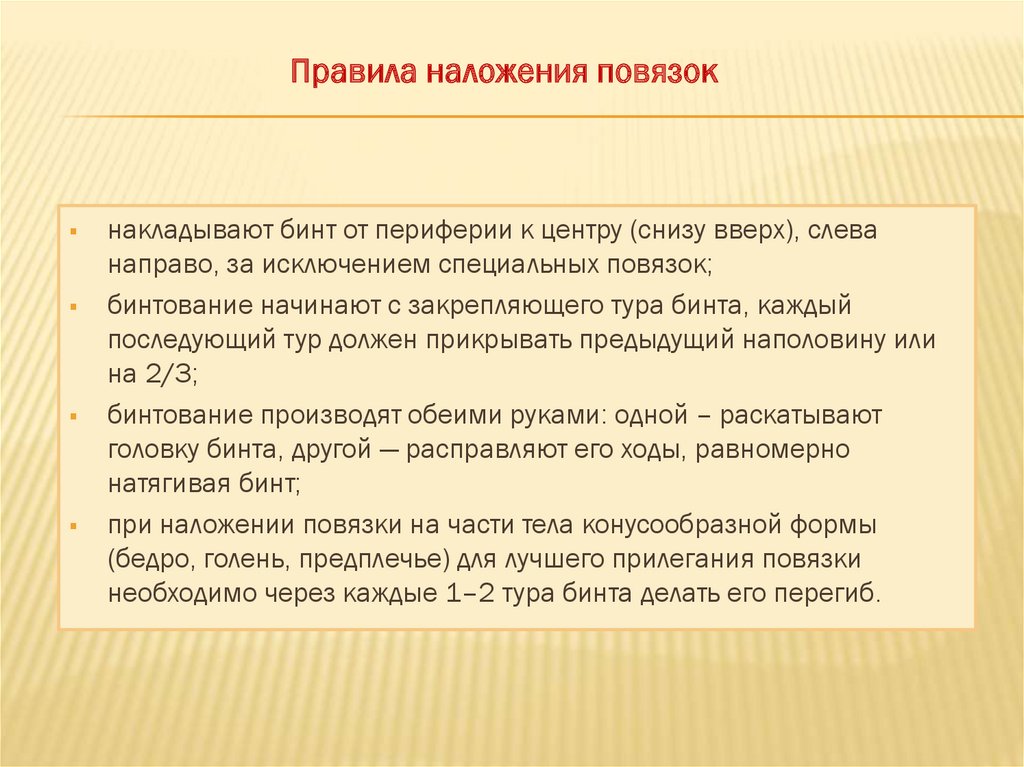 Правила наложения повязокнакладывают бинт от периферии к центру (снизу вверх), слева