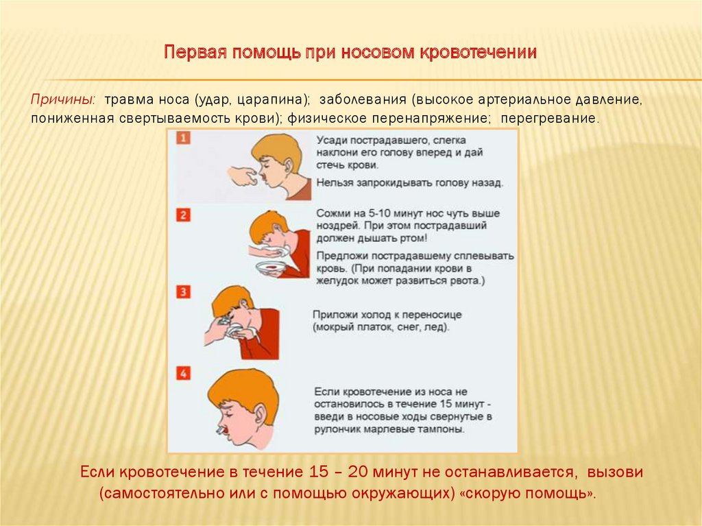 Первая помощь при носовом кровотеченииПричины: травма носа (удар, царапина); заболевания (высокое артериальное давление,