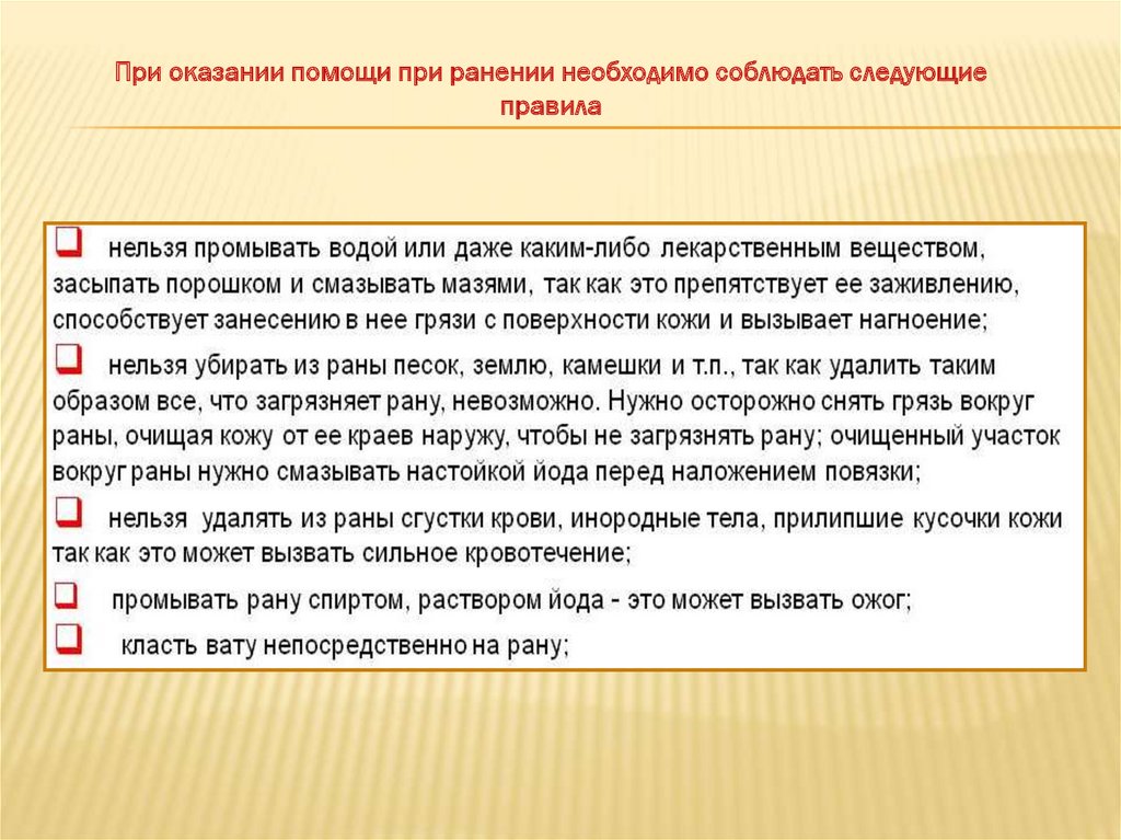 При оказании помощи при ранении необходимо соблюдать следующиеправила