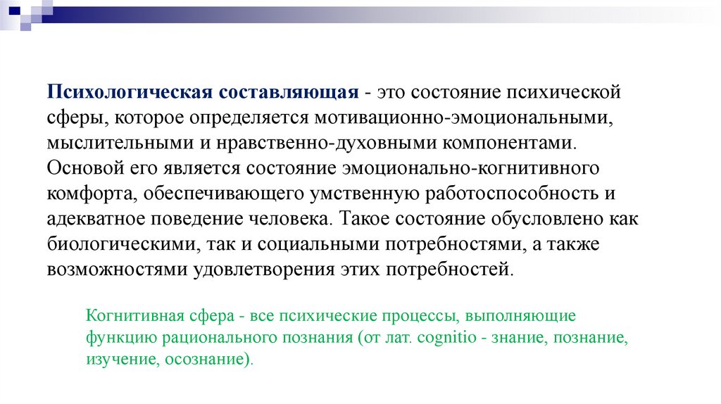 Психологическая составляющая - это состояние психическойсферы, которое определяется мотивационно-эмоциональными,