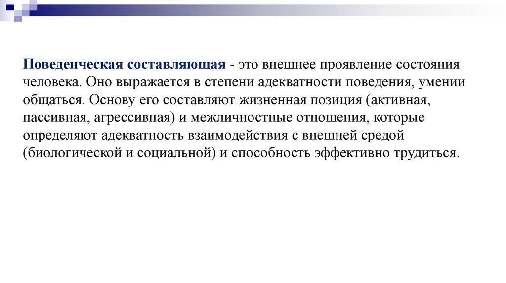 Поведенческая составляющая - это внешнее проявление состояниячеловека. Оно выражается в степени адекватности поведения, умении