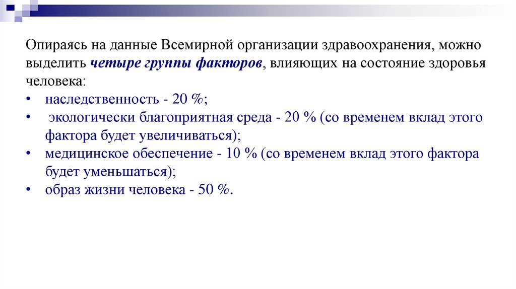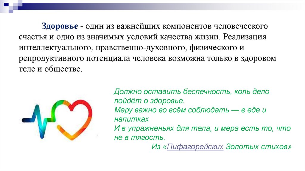 Здоровье - один из важнейших компонентов человеческогосчастья и одно из значимых условий качества жизни. Реализация