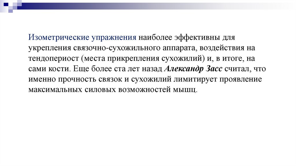 Изометрические упражнения наиболее эффективны дляукрепления связочно-сухожильного аппарата, воздействия на