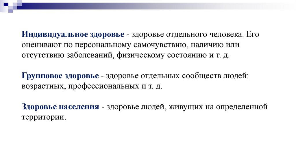Индивидуальное здоровье - здоровье отдельного человека. Егооценивают по персональному самочувствию, наличию или