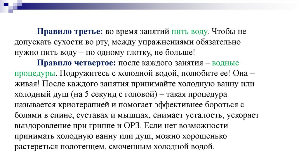 Правило третье: во время занятий пить воду. Чтобы недопускать сухости во рту, между упражнениями обязательно