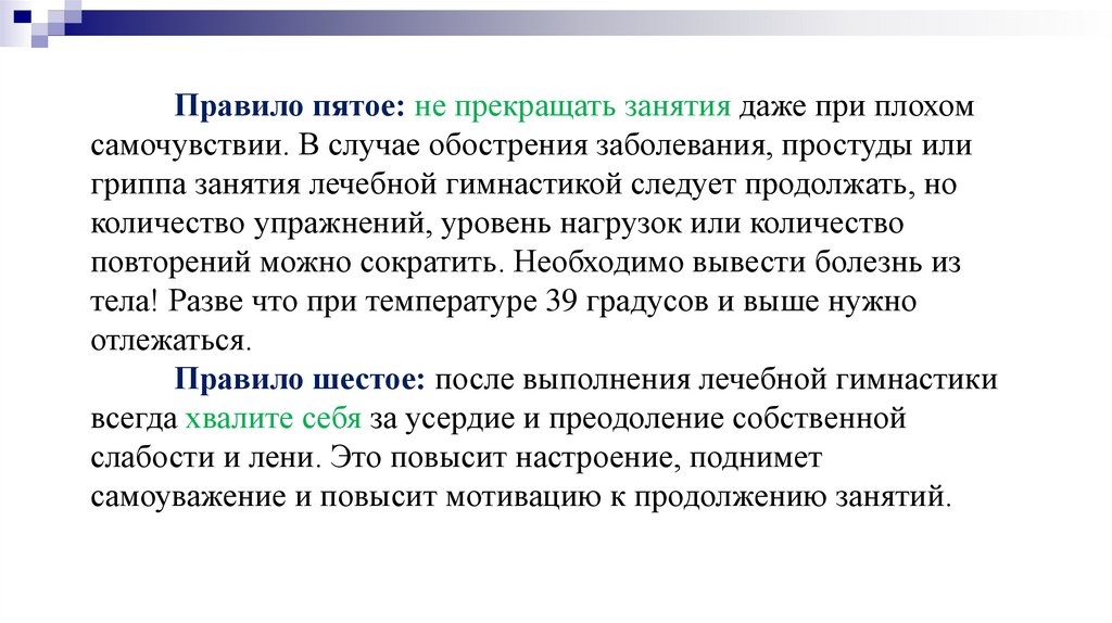 Правило пятое: не прекращать занятия даже при плохомсамочувствии. В случае обострения заболевания, простуды или