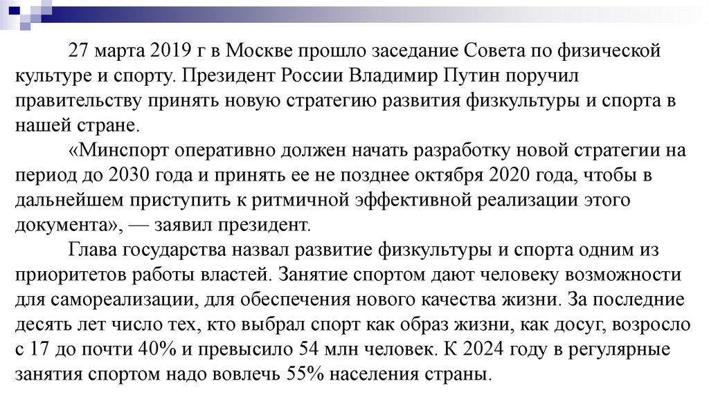 27 марта 2019 г в Москве прошло заседание Совета по физическойкультуре и спорту. Президент России Владимир Путин поручил