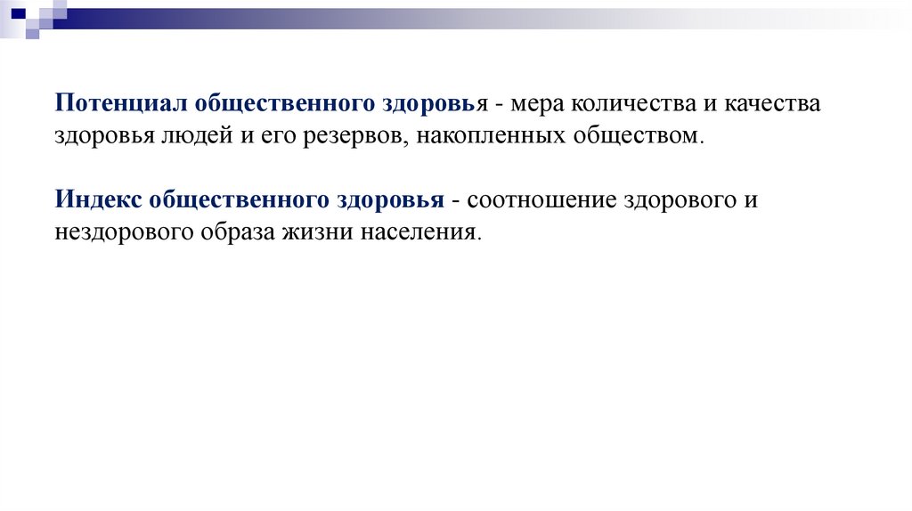 Потенциал общественного здоровья - мера количества и качестваздоровья людей и его резервов, накопленных обществом.