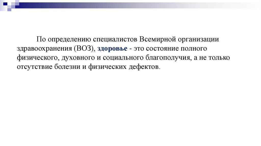 По определению специалистов Всемирной организацииздравоохранения (ВОЗ), здоровье - это состояние полного