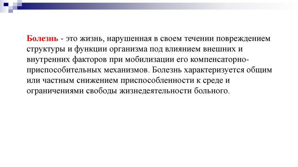 Болезнь - это жизнь, нарушенная в своем течении повреждениемструктуры и функции организма под влиянием внешних и