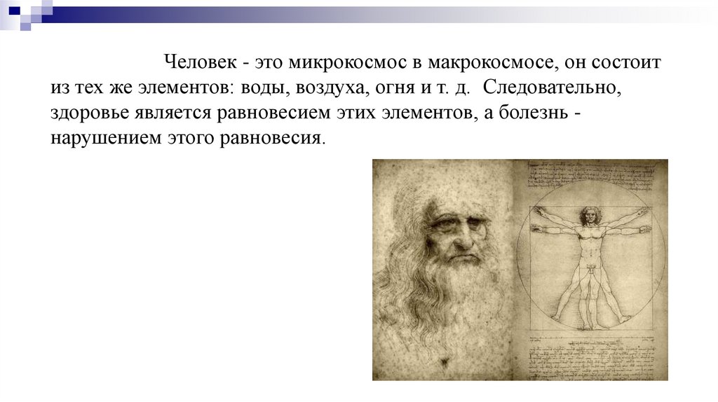 Человек - это микрокосмос в макрокосмосе, он состоитиз тех же элементов: воды, воздуха, огня и т. д. Следовательно,