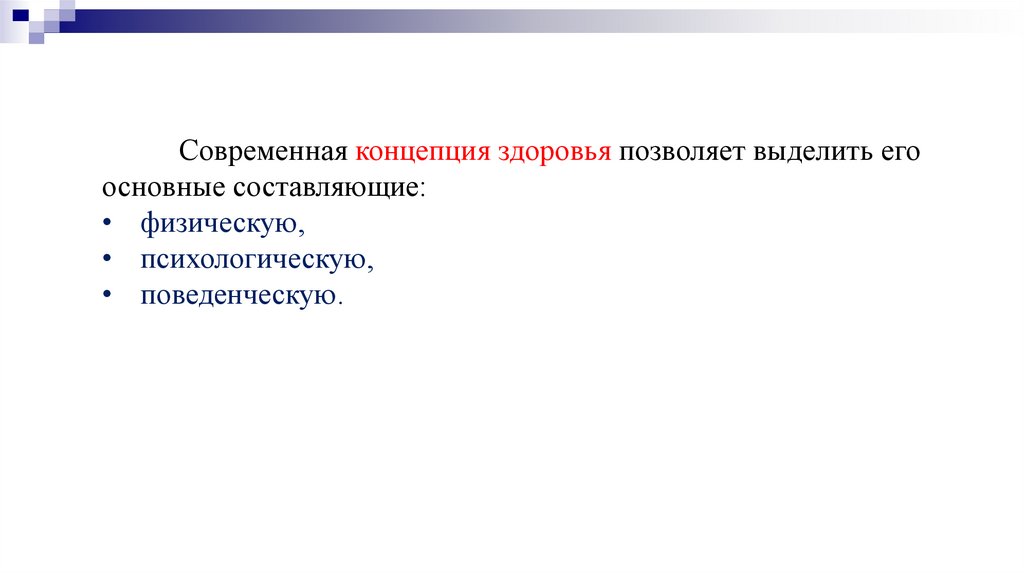 Современная концепция здоровья позволяет выделить егоосновные составляющие:
