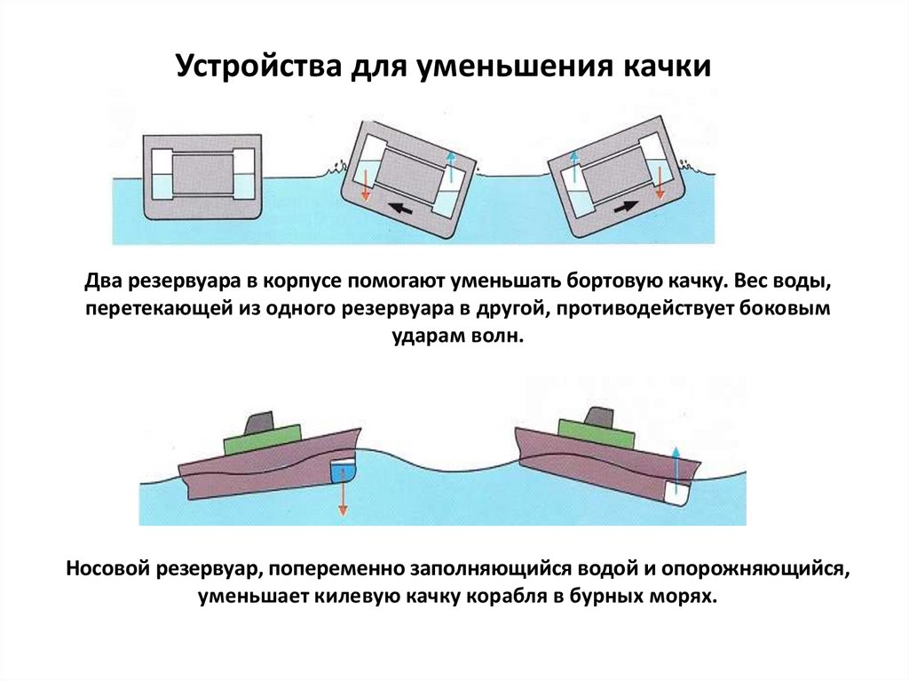 Устройства для уменьшения качкиДва резервуара в корпусе помогают уменьшать бортовую качку. Вес воды,