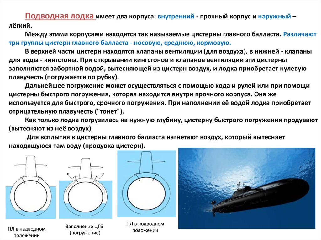 Между этими корпусами находятся так называемые цистерны главного балласта. Различают