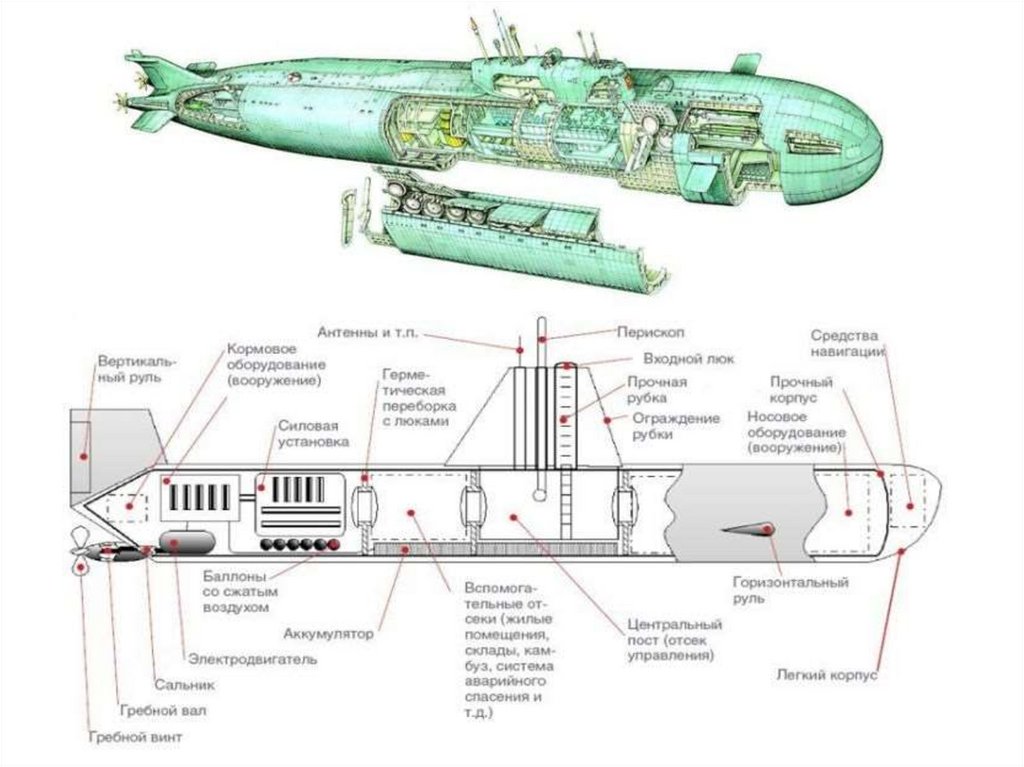 Подводная лодка имеет два корпуса: внутренний - прочный корпус и наружный –лёгкий.